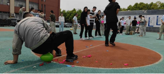 第二項進行的是“合力吹氣球”,共有六組參加,每組4人,每個人分工不同,吹、扎、運、破,完整的運送5個氣球并用屁股坐破所用的時間最短為獲勝。這個項目不僅考驗體力活、手工活,還考驗足夠強大的肺活量。