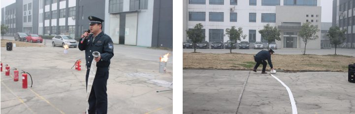 針對距離較長、突發火災或猛火,保安部謝隊長做了詳細的介紹,并實地演練了水帶、水槍、閥門、接頭的正確使用與安裝順序,并為員工展示了鋪設水帶、安裝閥門和銜接水槍。